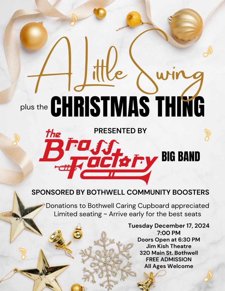 Sponsored by the Bothwell Community Boosters, The Brass Factory Big Band is excited to present “A Little Swing… plus the Christmas Thing” in THE JIM KISH THEATRE. A holiday celebration for the community… fun swing music followed by traditional Christmas tunes with that big brass sound that will fill the hall! Free admission for all ages! Donations to Bothwell Little Caring Cupboard appreciated. Seating is limited: Doors open 6:30, Show 7:00 pm. Mark your calendar for this festive event!