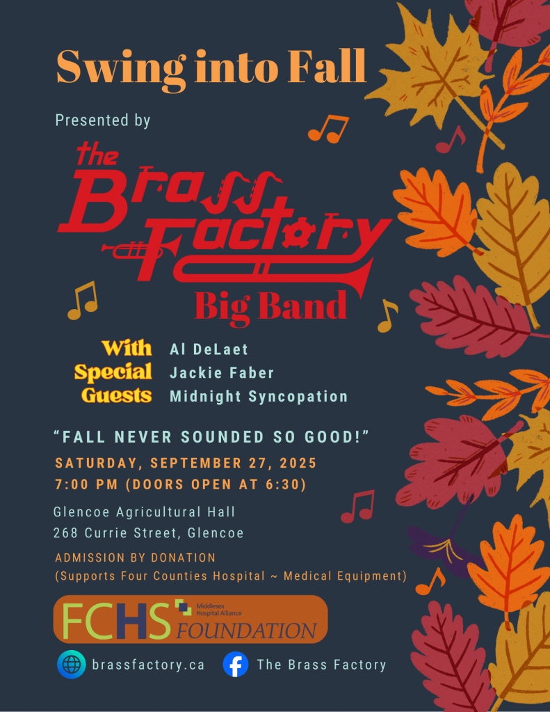 We’ve teased you for a few weeks and have been anxiously awaiting details to be ironed out so that we could make this extra special announcement. The Brass Factory Big Band is playing in Wallaceburg again! There are 3 things that get the citizens of Wallaceburg riled up. 1) our water 2) the imposition of regional government and 3) anything to do with our hospital. Everyone should now be aware that there are BIG PLANS for our hospital and the Brass Factory is pleased to be teaming-up with the CKHA Foundation in this fundraising and awareness opportunity, and hopefully, you’ll be just as happy to support it. Our concerts are always fun but this one will be extra special. We’ll start off playing some classic big band era music that you will both recognize, and love. Not only will our big band be playing, but we’re going back to the days when Tex Beneke and the Modernaires sang with the Glenn Miller Orchestra. Wait until you hear Midnight Syncopation, our amazing quartet harmonizing on some classic tunes! On top of that, we’ll also feature our own regular vocalists, Jackie Faber and Al DeLaet. After intermission we’re coming back to swing some great big band Christmas arrangements that will get your Christmas Season off to the best start possible. We anticipate a full house so put the date on your calendar and please share this announcement far and wide. Join us for the concert everyone will be talking about the day after. Let’s swing into Christmas, and for a good cause!